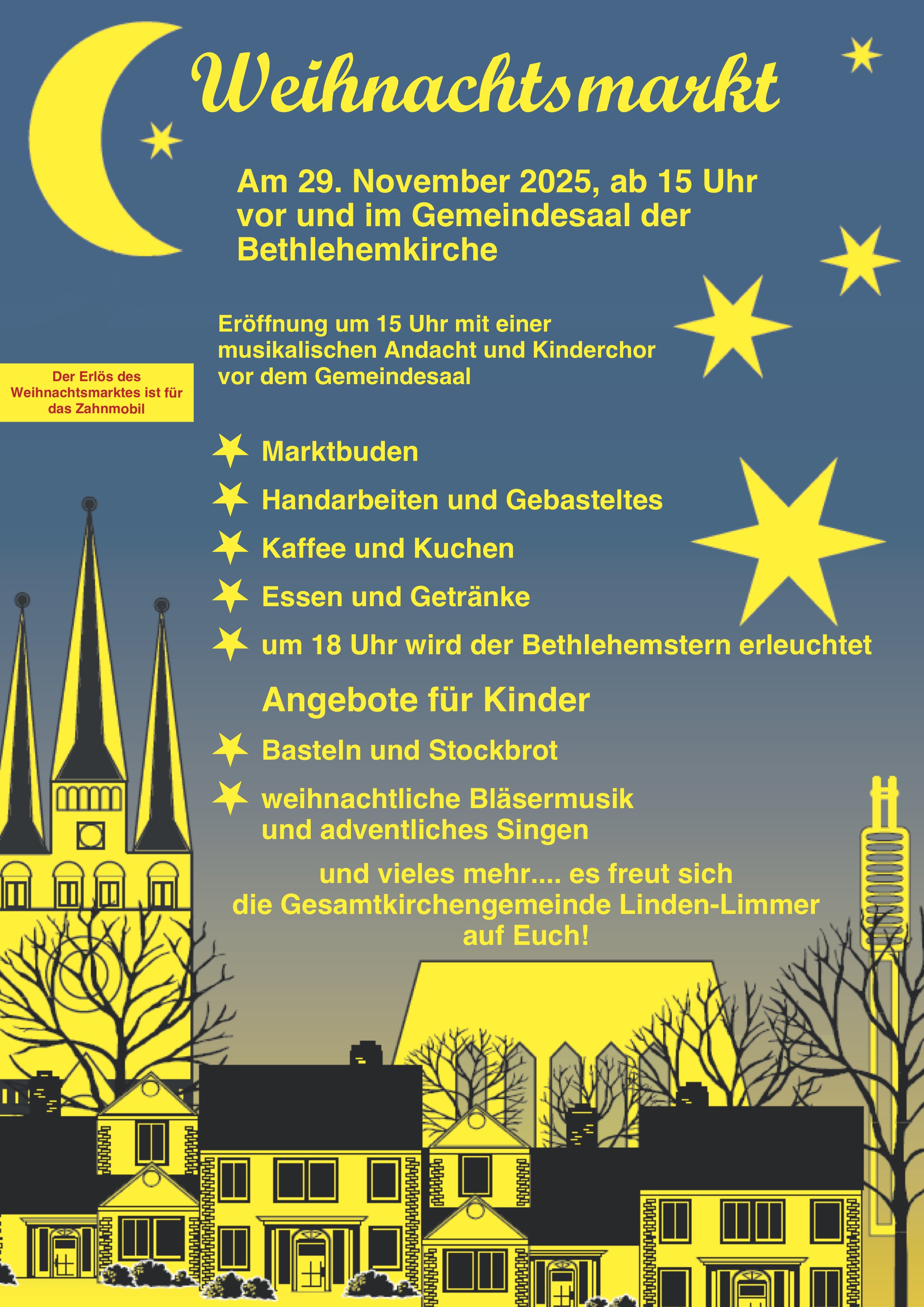 Der diesjährige Weihnachtsmarkt findet am Samstag, dem 29. November 2025, ab 15.00 Uhr vor dem Gemeindesaal der Bethlehemkirche statt. Mit einer musikalischen Andacht mit Kindern wird der Weihnachtsmarkt um 15 Uhr eröffnet. Für Groß und Klein gibt es viele Leckereien, Spiel- und Bastelangebote und vieles mehr. Um 18 Uhr wird der Stern von Bethlehem eingeschaltet und dazu gibt es ein adventliches Singen mit dem Bläserchor. In der Kirche bieten wir ein Bilderbuchkino an, neben Kaffee und Kuchen gibt es auch Deftiges zum Essen. Die Buden werden in diesem Jahr auch von Ausstellern aus dem Stadtteil bestückt. Der Erlös ist bestimmt für das Zahnmobil.