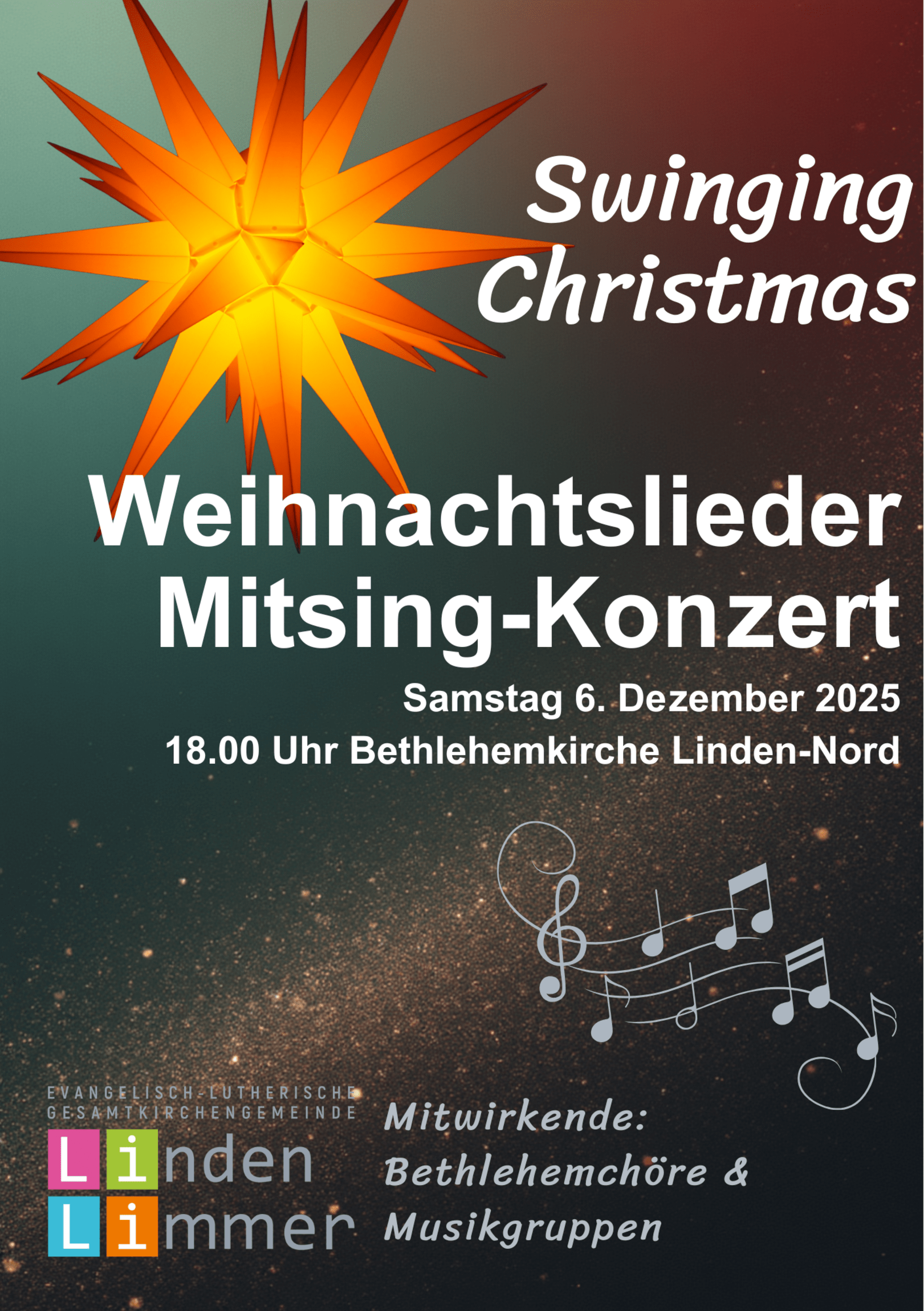 Am Samstag, 06. Dezember, um 18 Uhr findet in der Bethlehemkirche Hannover-Linden das Weihnachtskonzert der musikalischen Gruppen der Ortskirchengemeinde statt. Es agieren generationenübergreifend viele, die in der Kirchengemeinde musikalisch unterwegs sind. Das Programm beinhaltet internationale Weihnachtslieder, weihnachtliche Gospel und Filmsongs, mal traditionell, mal modern, poppig und jazzig. Das Publikum ist eingeladen, Weihnachtslieder aus aller Welt mit den ausführenden Akteuren gemeinsam zu singen.