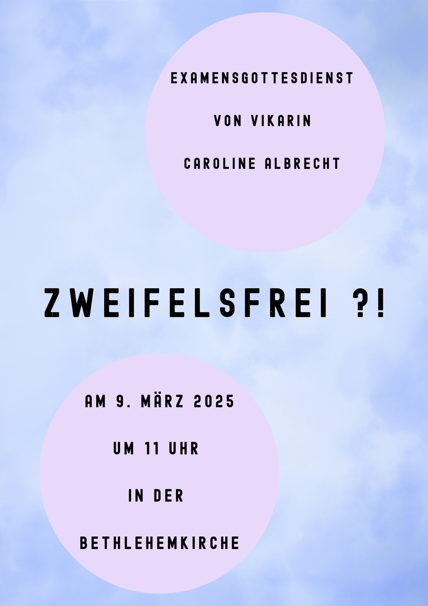 Wenn Sie und Ihr Lust habt, mich noch einmal zu treffen, dann lade ich herzlich ein zum Gottesdienst am 09.März 2025 in der Bethlehemkirche um 11 Uhr. Das ist mein Examensgottesdienst, von daher wäre es toll, wenn viele Menschen da sind, um gemeinsam Gottesdienst zu feiern.