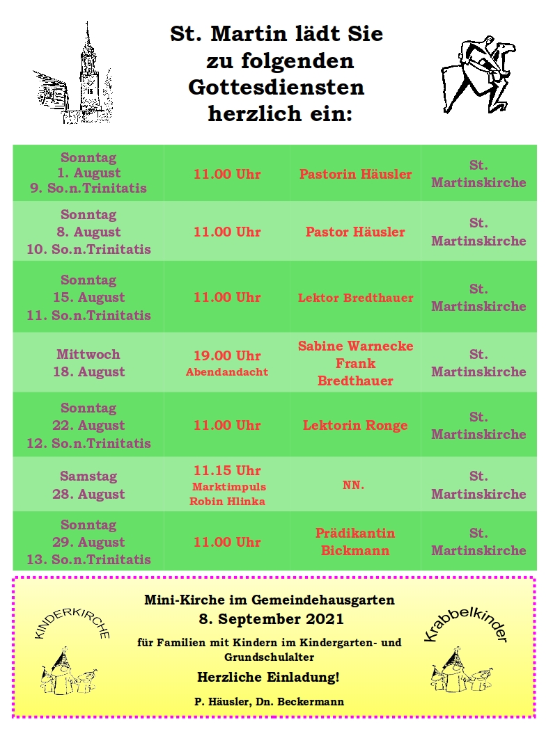 Gottesdienstplan St. Martin August 2021 Monatsspruch August 2021 Neige, HERR, dein Ohr und höre! Öffne, HERR, deine Augen und sieh her! 2. Könige 19, 16