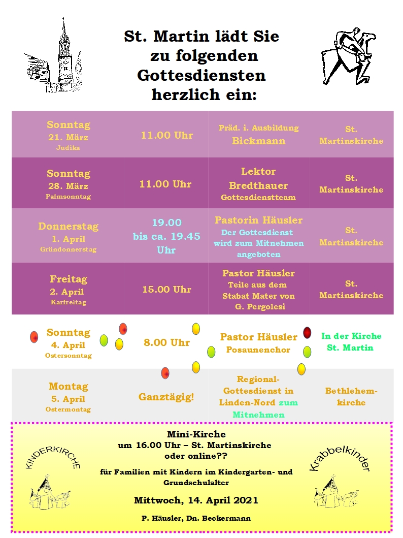 Bitte beachten Sie, bitte beachtet, dass die geltenden Hygienevorschriften einzuhalten sind (u.a.: Mindestabstände einhalten, medizinische Masken, kein Gemeindegesang, Handdesinfektion, Kontaktadressdaten werden erfasst).