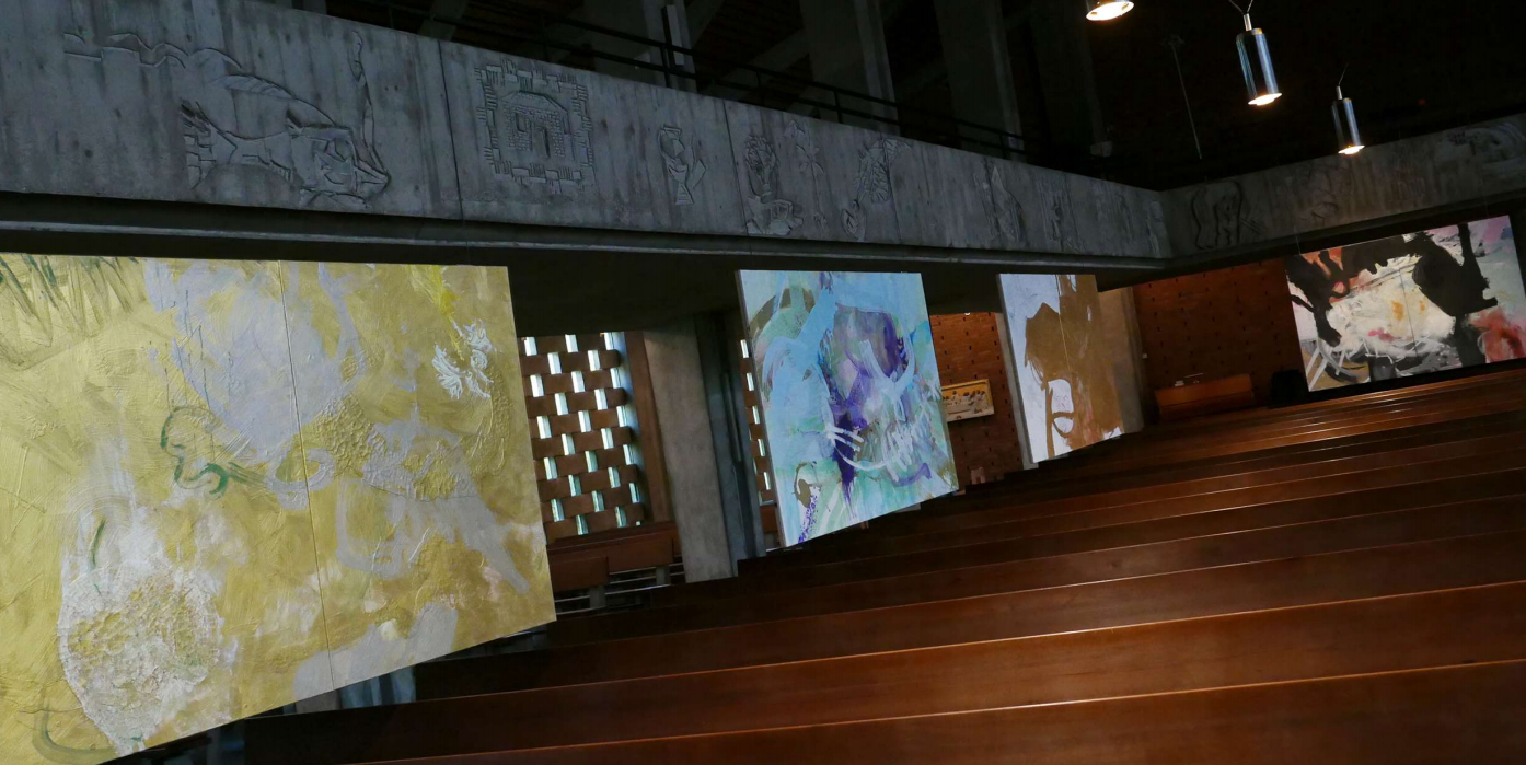 Seit Ostern 2021 sind vier großformatige Bilder in der St. Martinskirche zu sehen. Der Kirchenraum des Architekten Dieter Oesterlen und die Arbeiten von Rolf Heinrich gehen dabei eine spannende Symbiose ein.