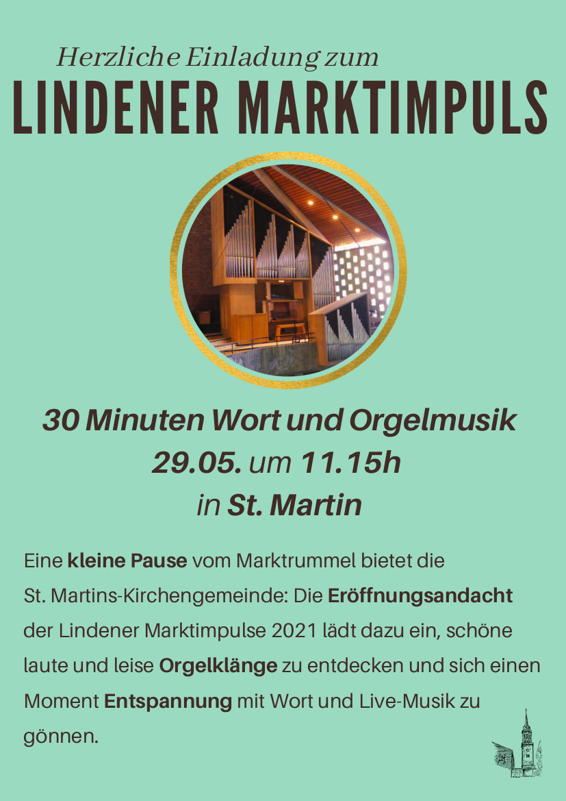 Eine kleine Pause vom Marktrummel bietet die St. Martins-Kirchengemeinde: Die Lindener Marktimpulse 2021 laden dazu ein, schöne laute und leise Orgelklänge zu entdecken und sich 30 Minuten Entspannung mit Wort und Live-Musik zu gönnen.