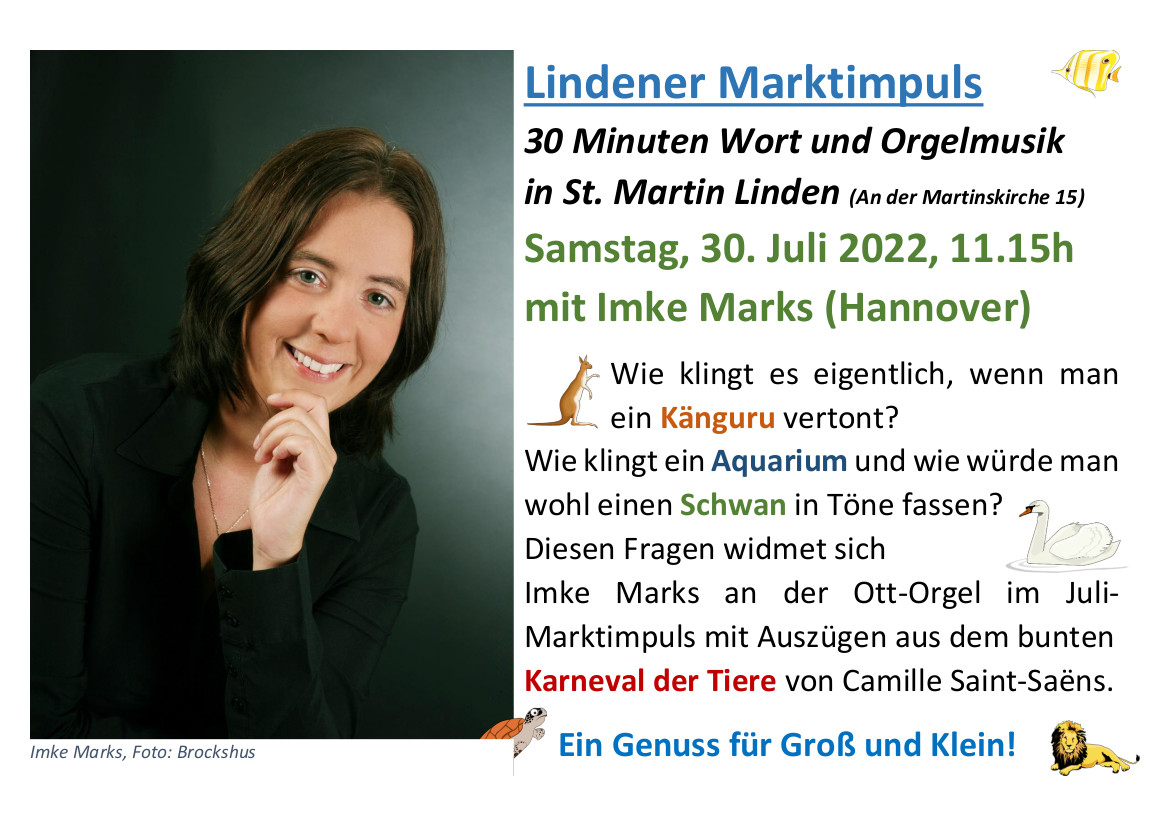 Lindener Marktimpuls Werke von Camille Saint-Saëns - Auszüge aus "Karneval der Tiere" Ein Genuss für Groß und Klein! An der Orgel: Imke Marks, Hannover
