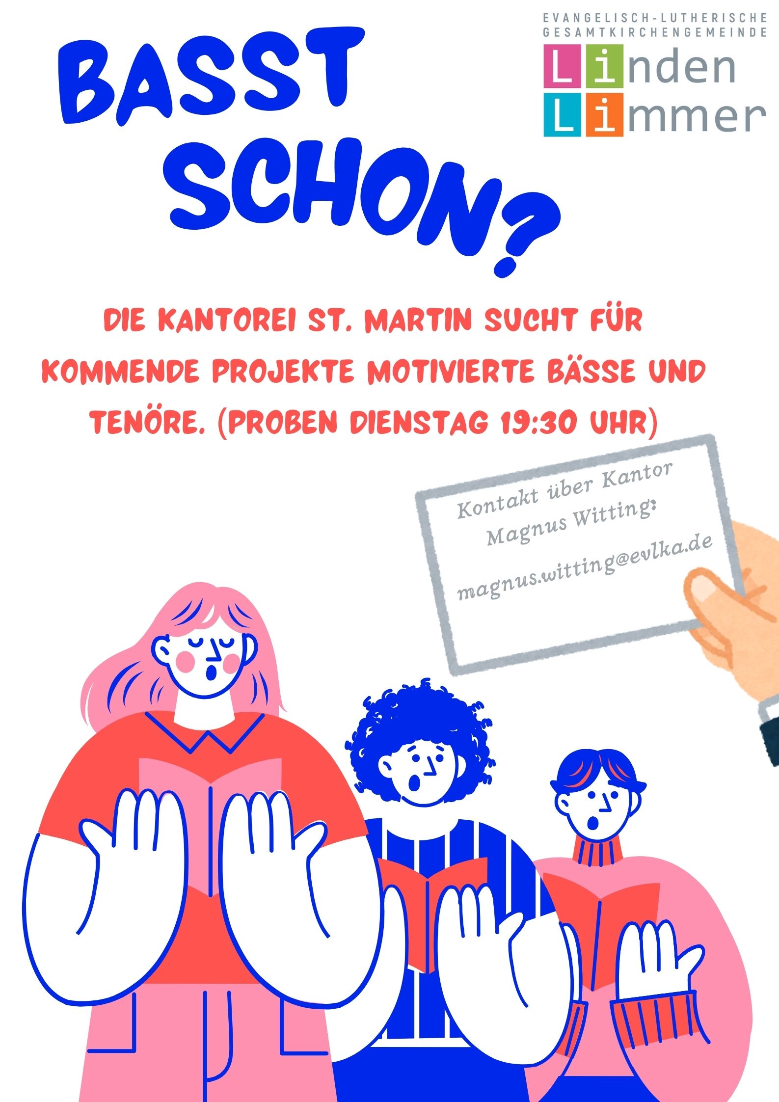 Diese Chorprobe beginnt ausnahmsweise in der Kirche pünktlich um 19:30 Uhr und dauert mit kurzen Pausen bis ca. 21:30 Uhr. Bitte plant etwas mehr Zeit ein als sonst. Mitglieder der Besetzungskommission werden bei dieser Probe anwesend sein.