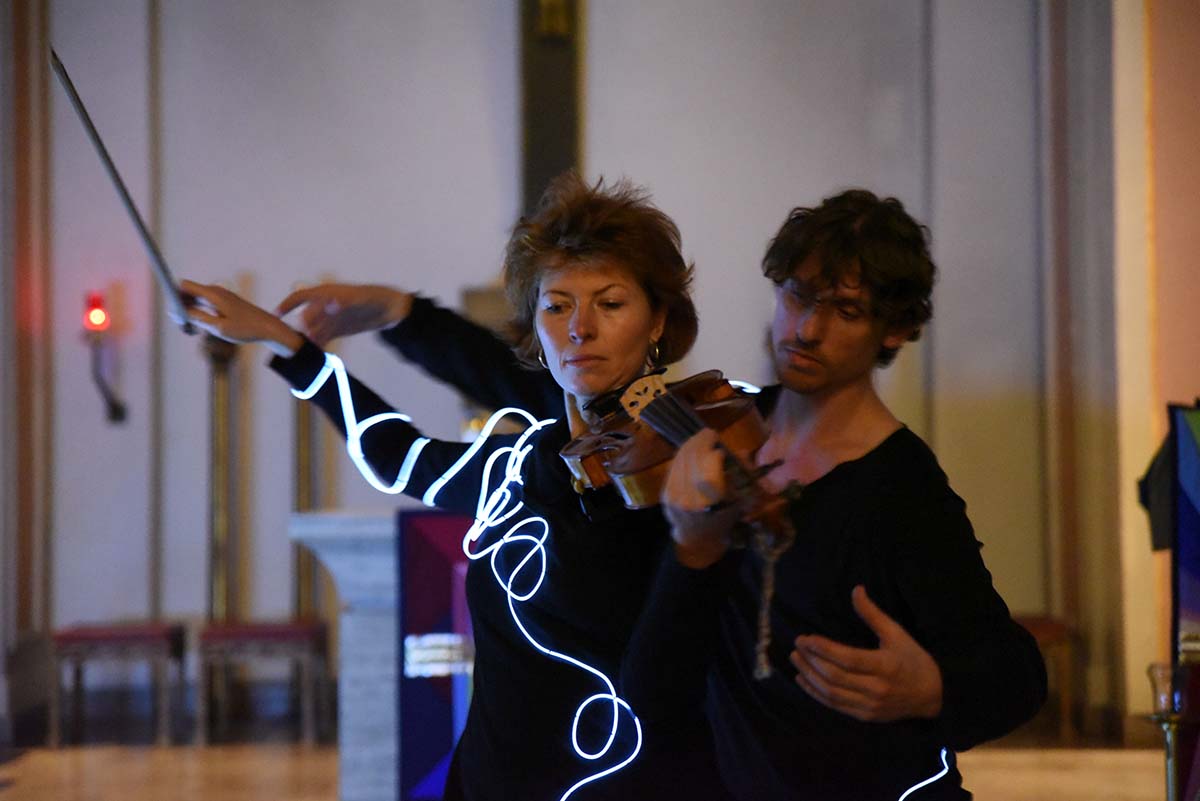 Durch Verbindung von Musik, Tanz, Gesang und Lichtkunst verwandeln die Künstler*innen den Kirchenraum zu einem sinnlichen Gesamtkunstwerk. Die Musiker*innen des Ensemble Megaphon (unter der Leitung von Lenka Župková) spannen gemeinsam mit der Kantorei St. Martin (unter der Leitung der Kantorin Isabelle Grupe) einen musikalischen Bogen von Hildegard von Bingens mystischen Gesängen aus dem 12. Jahrhundert über Henry Purcells „Music for a while“ aus dem 17. Jahrhundert bis hin zu den persischen Improvisationen von Ehsan Ebrahimi auf der Santur und Neuer Musik. Alles begegnet sich in einem musikalischen Dialog.